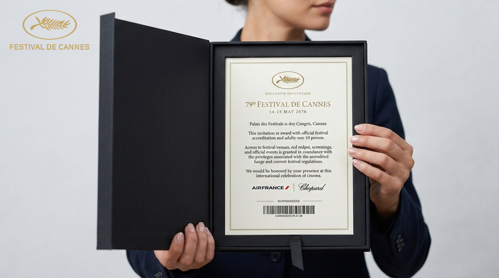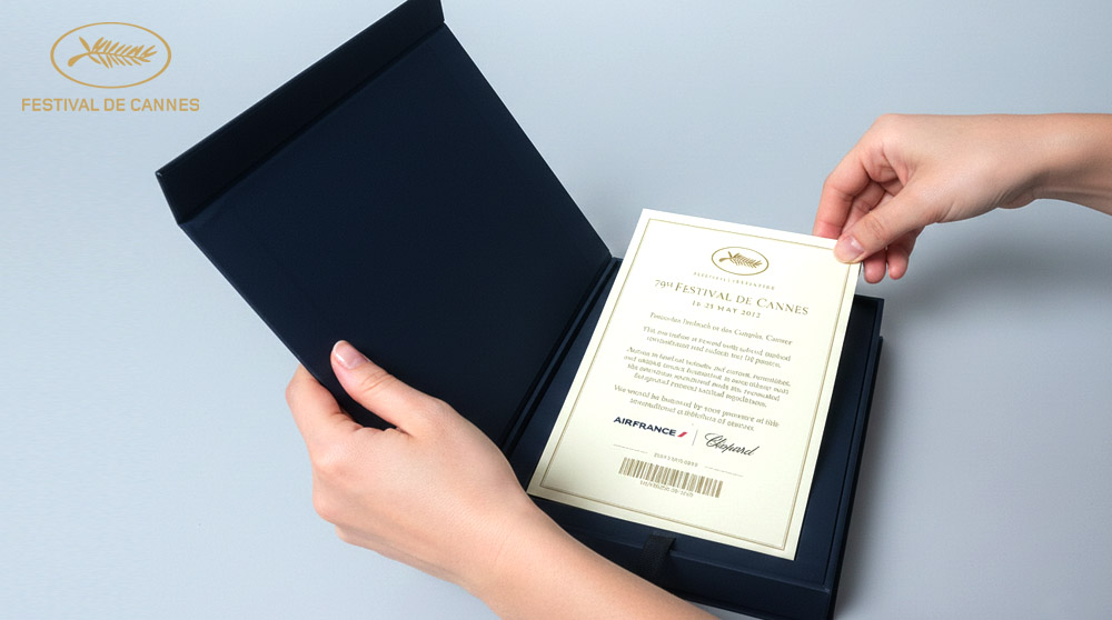 CIBS Media proudly designed and produced a luxury invitation card and custom box envelope for the Cannes Film Festival 2026. This premium project featured elegant gold foil stamping and refined spot UV printing, creating a striking contrast of metallic brilliance and glossy texture against a rich matte background. Printed on high-quality cardstock and presented in a rigid box envelope, the invitation reflected sophistication and exclusivity. Our team managed the complete process from creative design to precision finishing. This project highlights our expertise in luxury invitation printing, foil printing, UV printing, and premium event packaging services in Dubai, UAE.