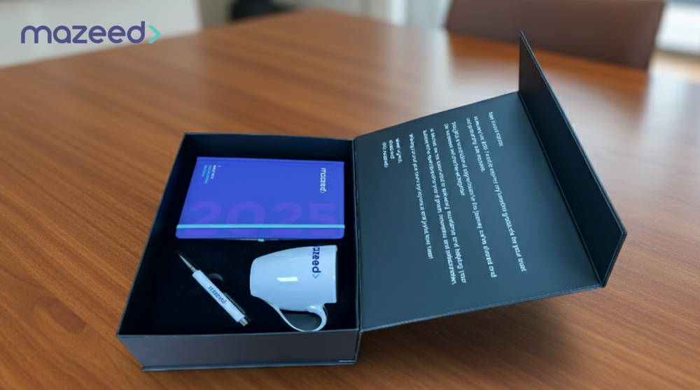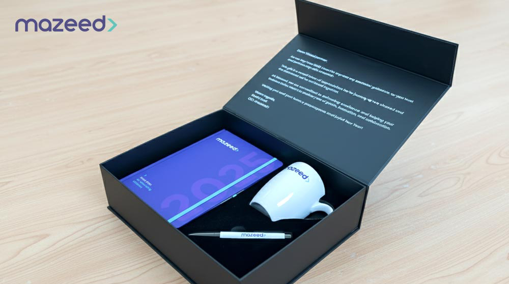 We created a custom corporate gift box for Mazeed, a leading accounting and tax consultancy firm in Dubai, featuring premium branded items and elegant packaging that reflect their professional identity. Each product was customized with Mazeed’s logo to enhance brand visibility and client engagement. As experts in corporate gifts in Dubai, CIBS specializes in customized gift boxes, branded merchandise, and promotional items designed to help businesses strengthen relationships, improve brand recognition, and create a lasting impression through high-quality corporate gifting solutions.
